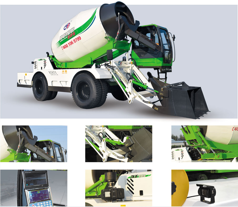 “重型”球形鞍座上安装的反力架可以290°液压旋转,并且通过液压式制动器自动锁止。滚筒旋转通过柱塞泵和闭路中的柱塞液压马达实现,在操作室内和搅拌机后部拥有手动电气阀。